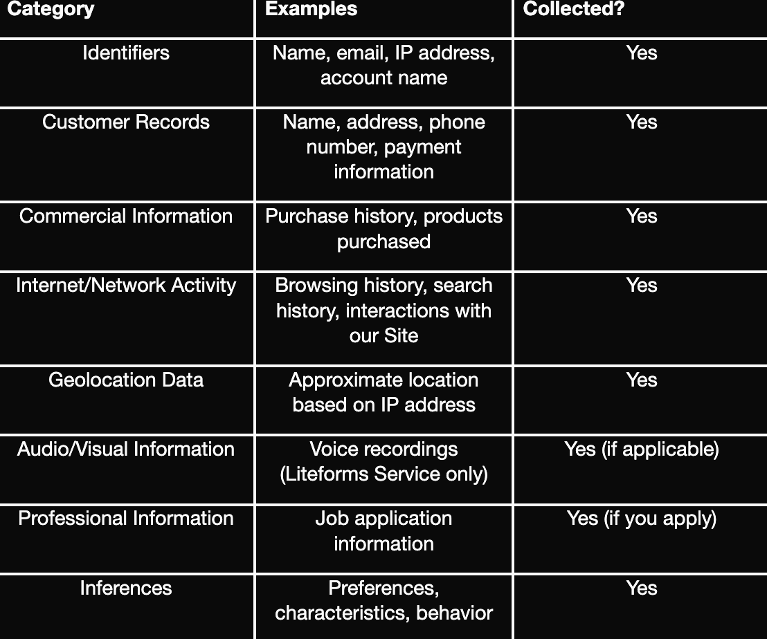 If you use our Liteforms Service, your spoken words may be captured and processed while the Liteforms application is active in order to detect, transcribe, and respond to your speech. Voice recordings may be temporarily stored on your device and sent in encrypted form to Microsoft Speech Services for transcription. Microsoft processes voice data in memory only and does not store the recordings. Transcriptions returned to the Liteforms Service may be stored and used to operate, maintain, and improve our Products and services.
